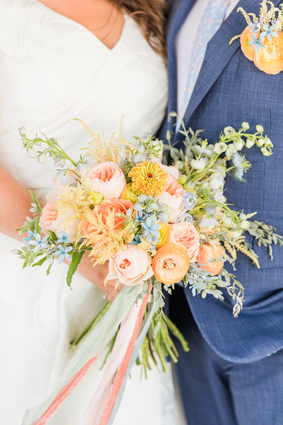 specialty flowers and fillers that were utilized in these wedding arrangements were ranunculus, astilbe, blue delphinium, blue nigella, tweedia, hypericum berries, zinnias, dahlias, hydrangea, celosia fruit punch, roses, eucalyptus, and carnations